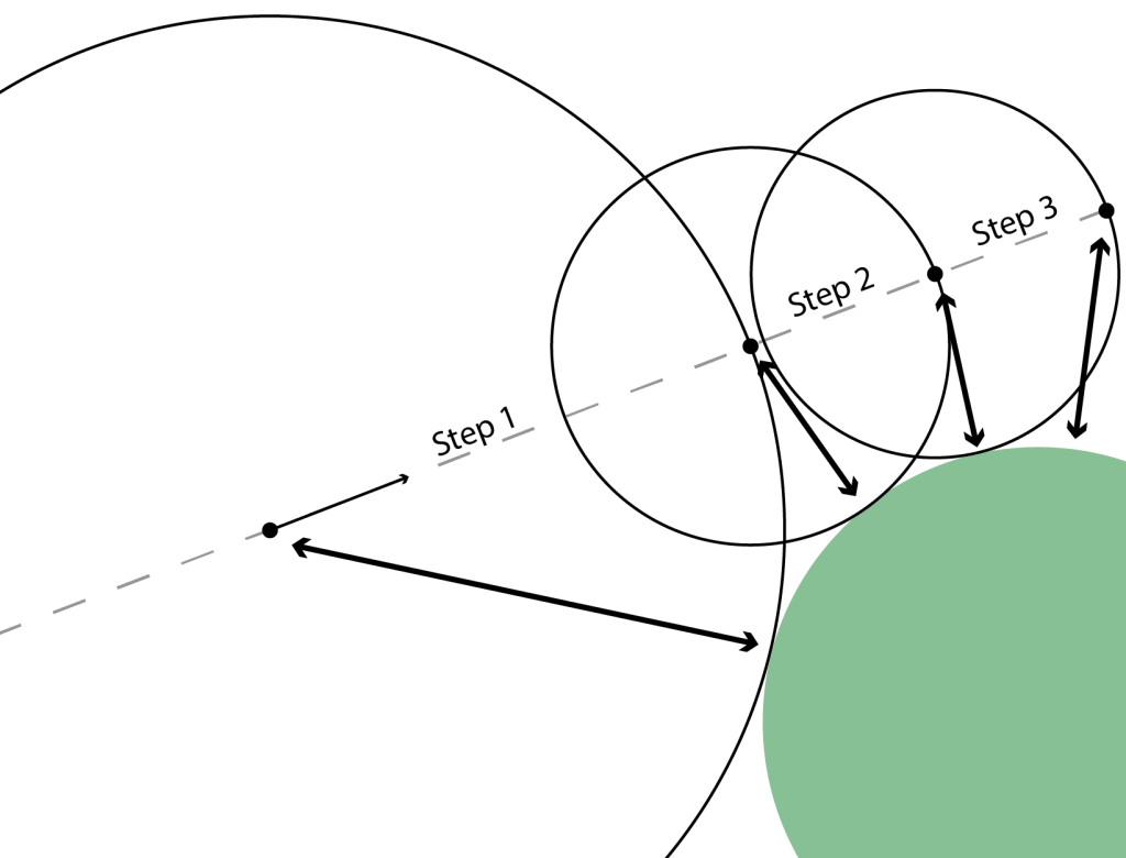 Here’s where the ‘ray tracing trick’ steps in. Instead of fixed timesteps, what if took longer steps when we are further from the target, and smaller ones when we are closer?