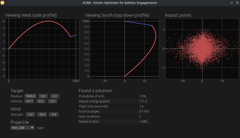 The graph above shows 100 samples of KOBE computing the ideal launch trajectory of a 7.62×51mm NATO round at a target 1km away. Despite also simulating 50,000 impacts per sample, KOBE is still 4x faster than libballistics resolving a single path.